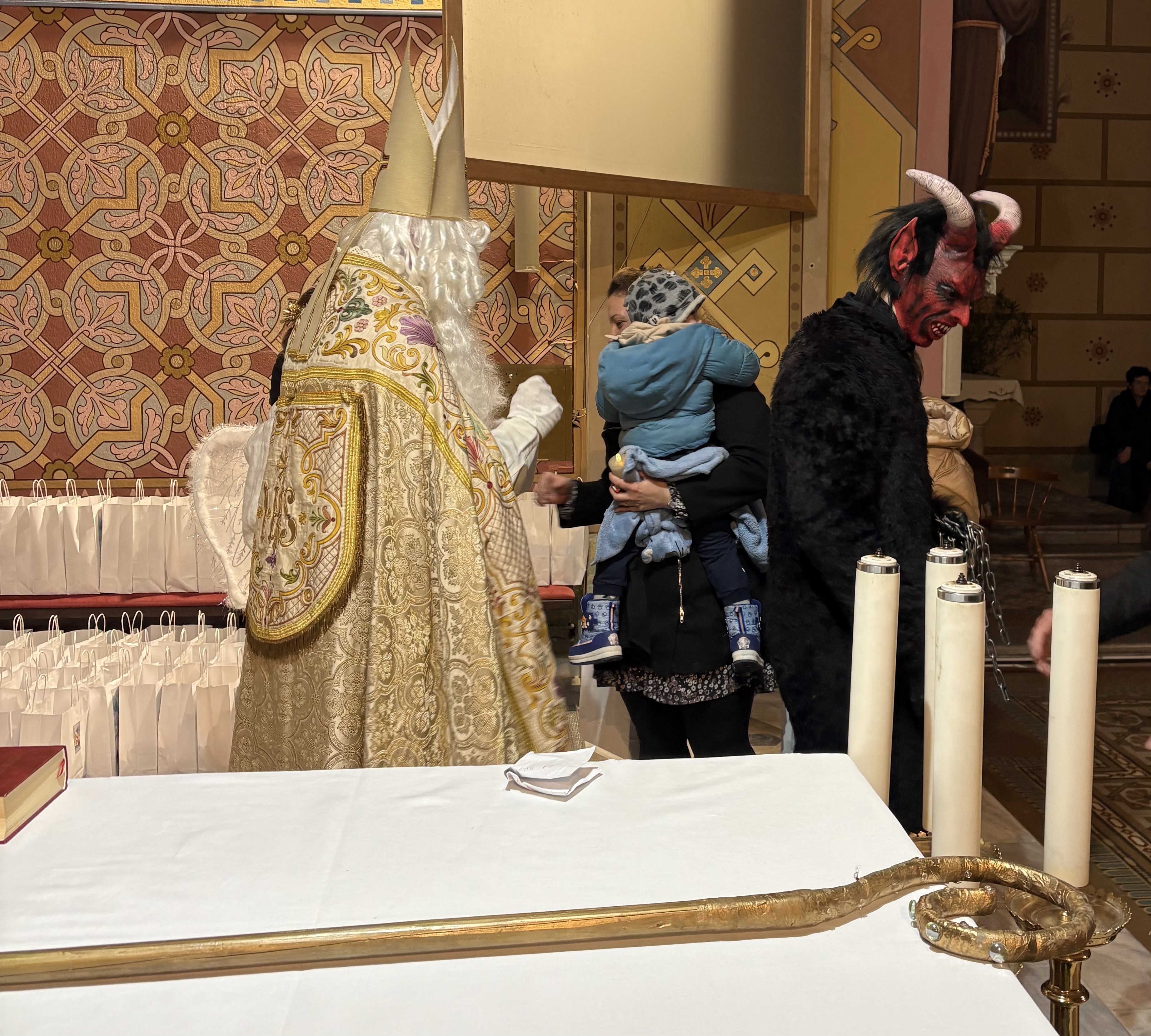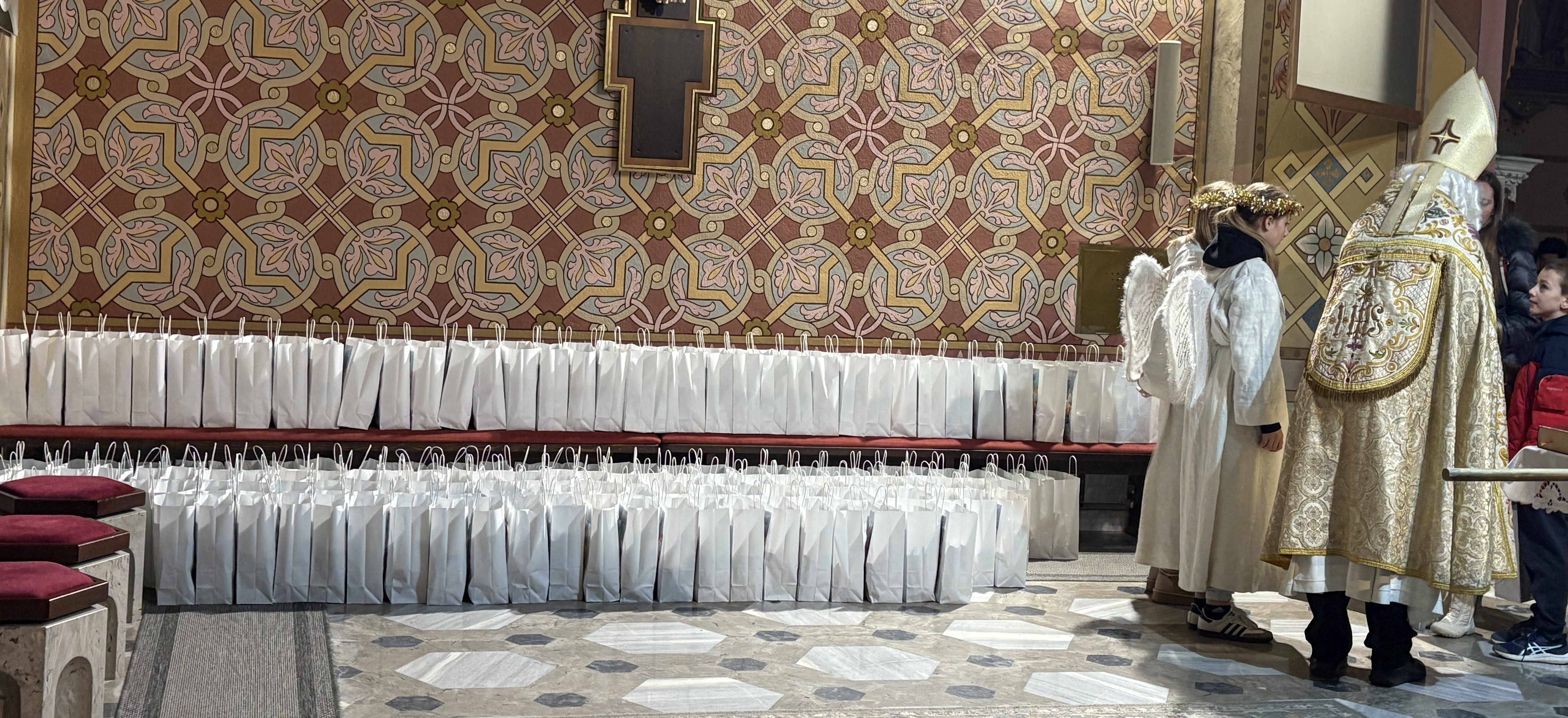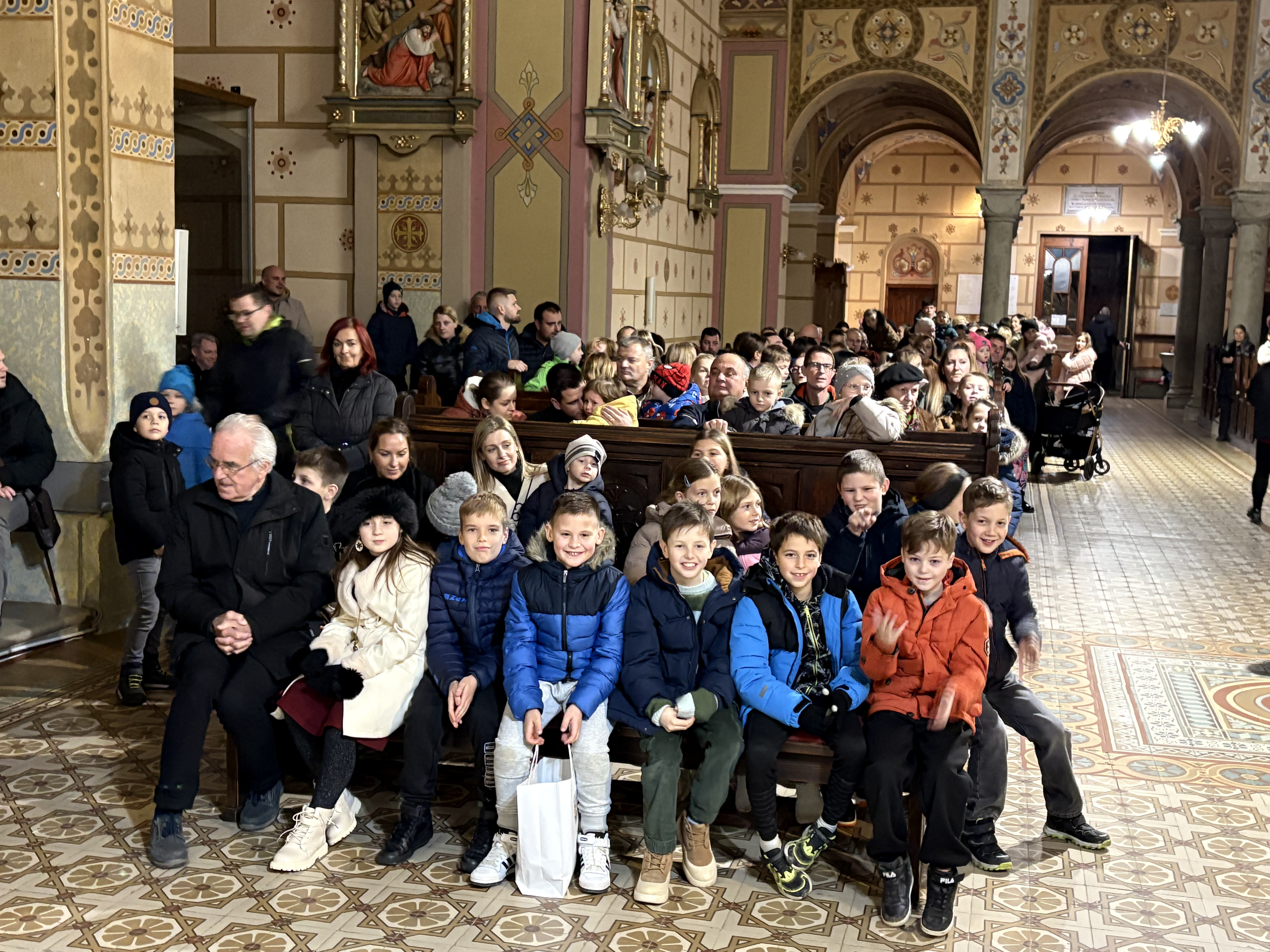 Kasneje je Miklavž obiskal 180 otrok v cerkvi sv. Jerneja. Najprej je otroke pozdravil domači župnik, ki je bil vesel, da se je v cerkvi zbralo toliko otrok, in izrazil željo, da bi večkrat prišli v cerkev, saj se približuje čudovit praznik, ko bo za otroke otroška polnočnica. Miklavž je z veseljem s pomočjo angelov razdelil darila. Za obdaritev so ob finančni pomoči staršev poskrbeli člani Karitas, ki so malo pomladili svoje vrste. Darila, za pripravo katerih imata velike zasluge predsednica Darinka Preložnik in Polonca Preložnik, so zelo praktična in uporabna, ki bodo otroke spremljala v prazničnem času in še kasneje. V mnogih domovih bo raslo božično žito, spoznavali bodo slovenske praznike, brali in igrali ter se sladkali. Na Miklavžev obisk s spremljevalci bodo ostali lepi spomini.Milena Jurgec